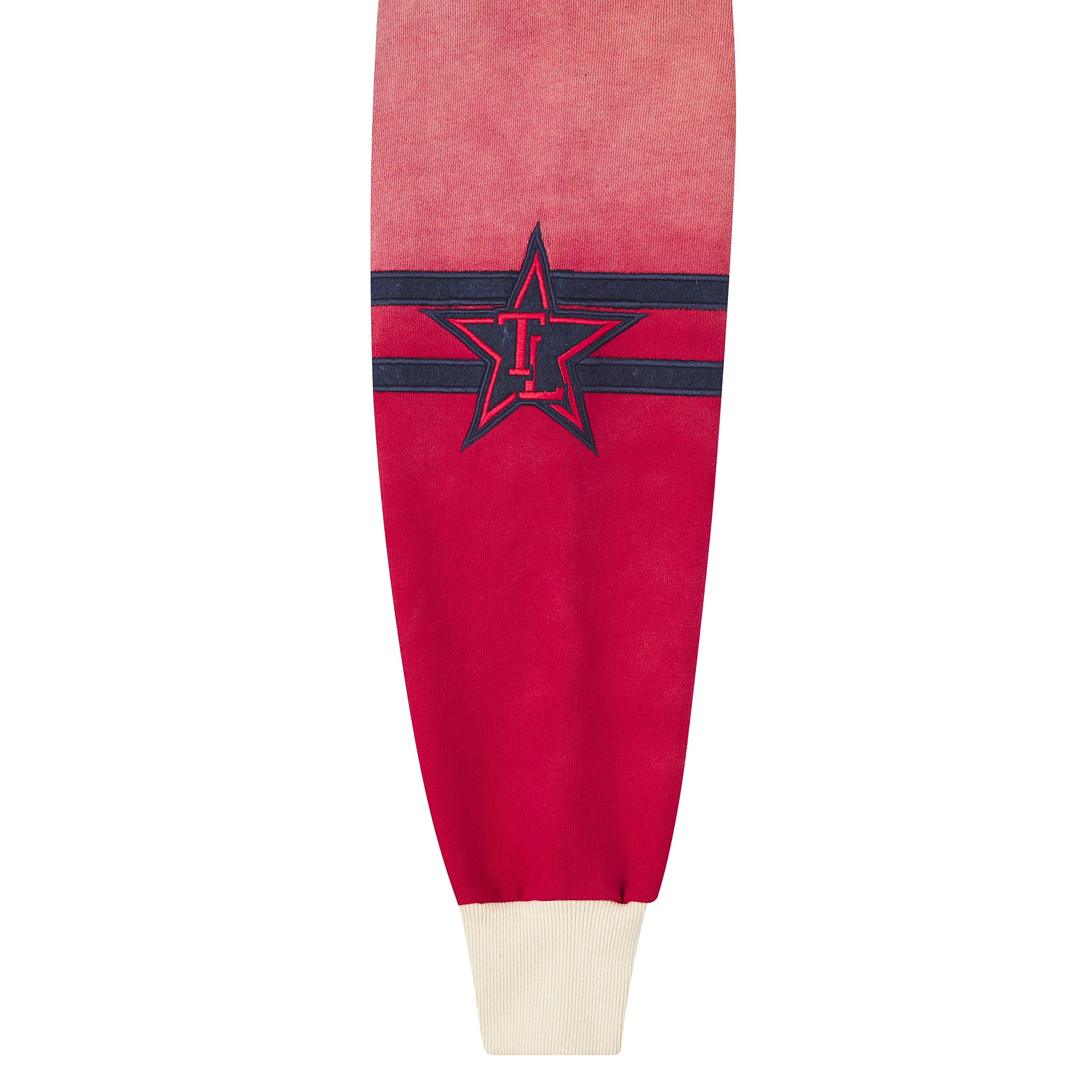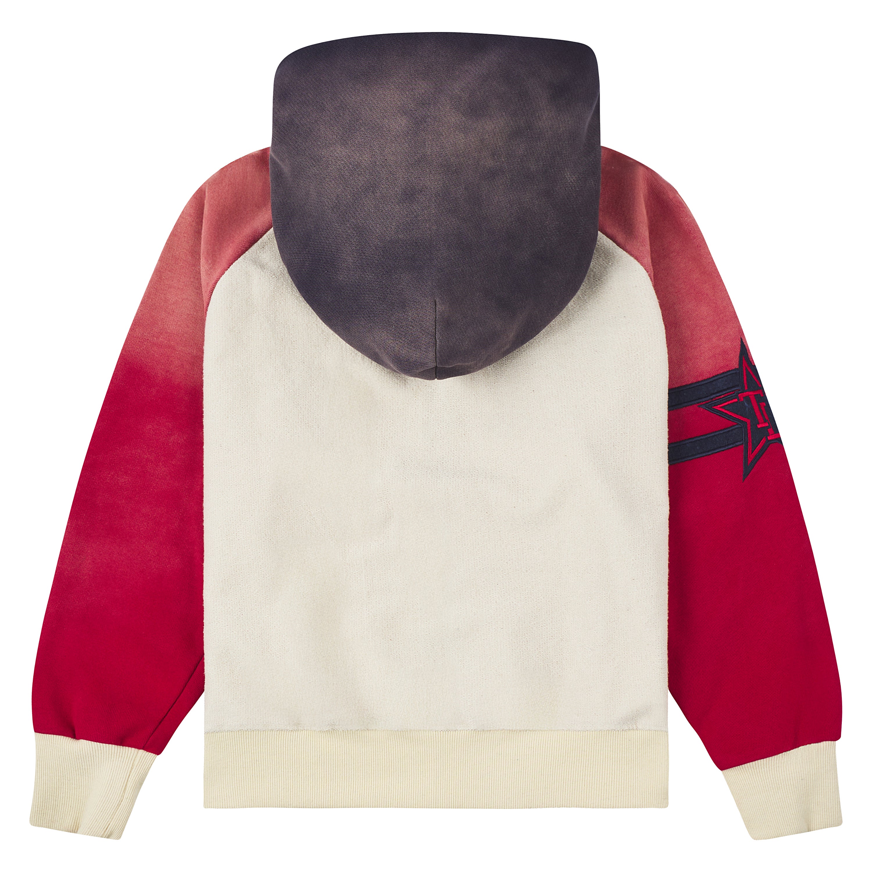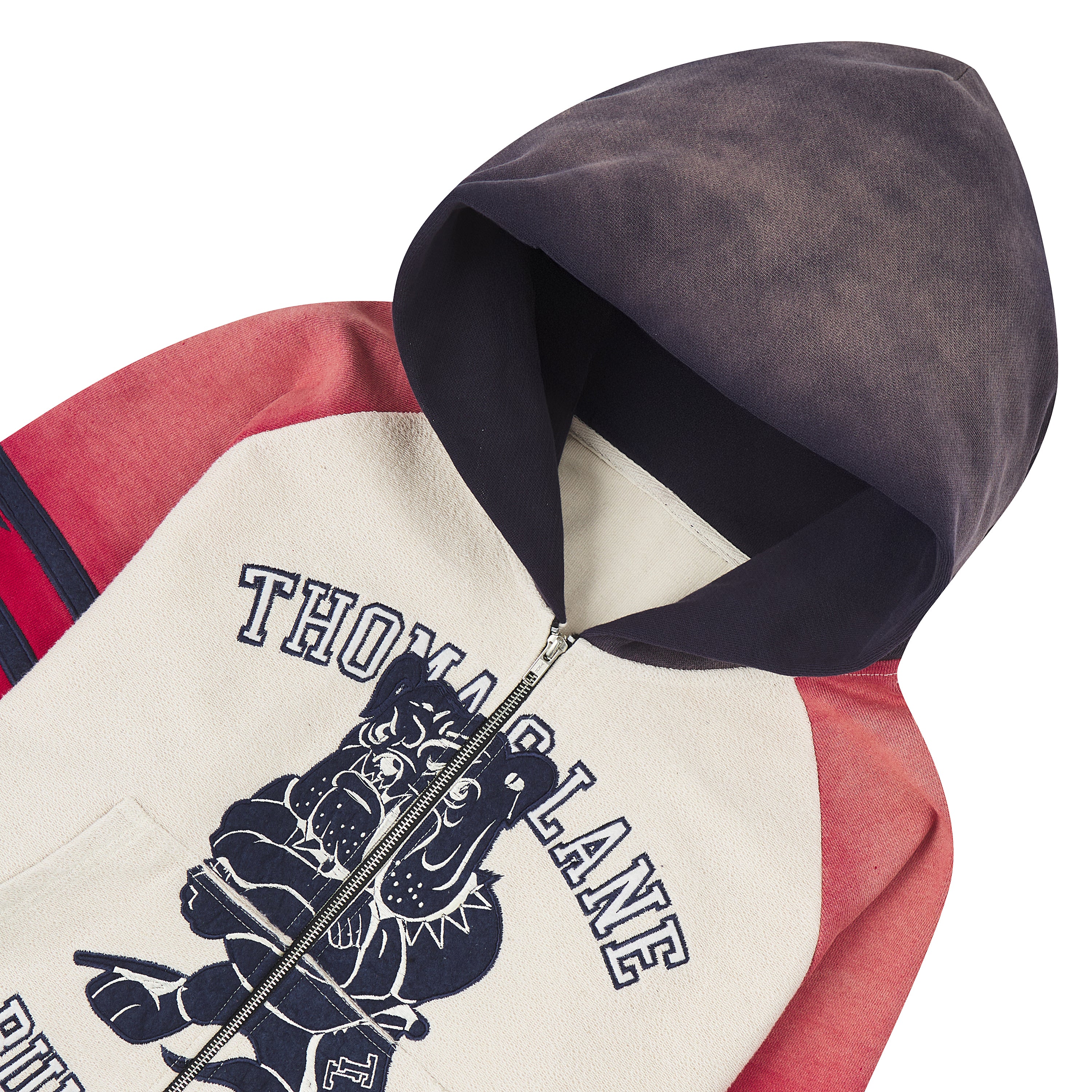 A nod to vintage athletics with a modern cut. The Bulldog Varsity Zip Hoodie features a custom panel-dyed body with a washed cream base, gradient red raglan sleeves, and a deep washed navy hood. A bold Bulldog mascot is chain-stitched on the chest, framed by arched Thomas Lane and Bulldogs collegiate lettering. Finished with ribbed cuffs and hem, kangaroo pockets, and contrast arm striping for a varsity touch.