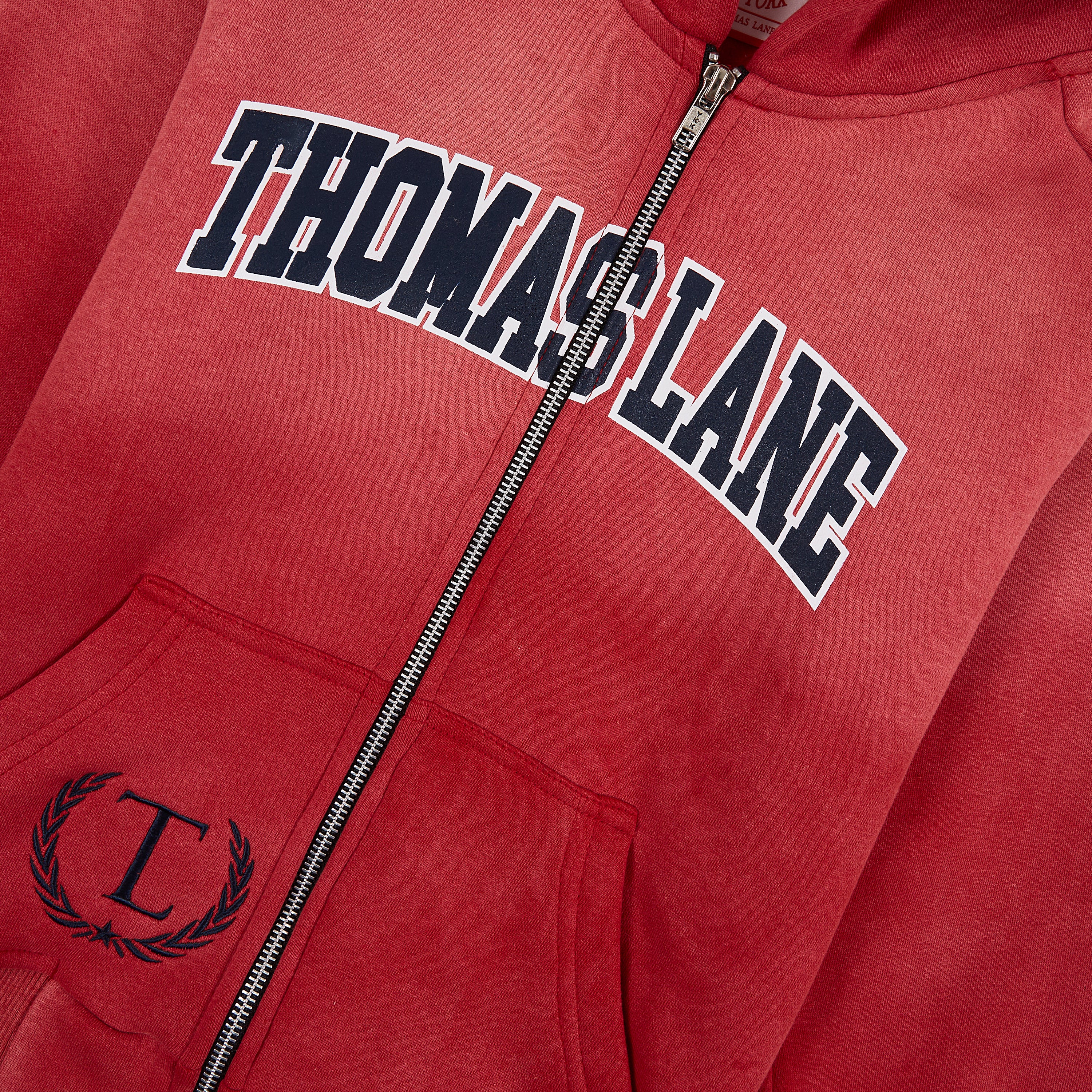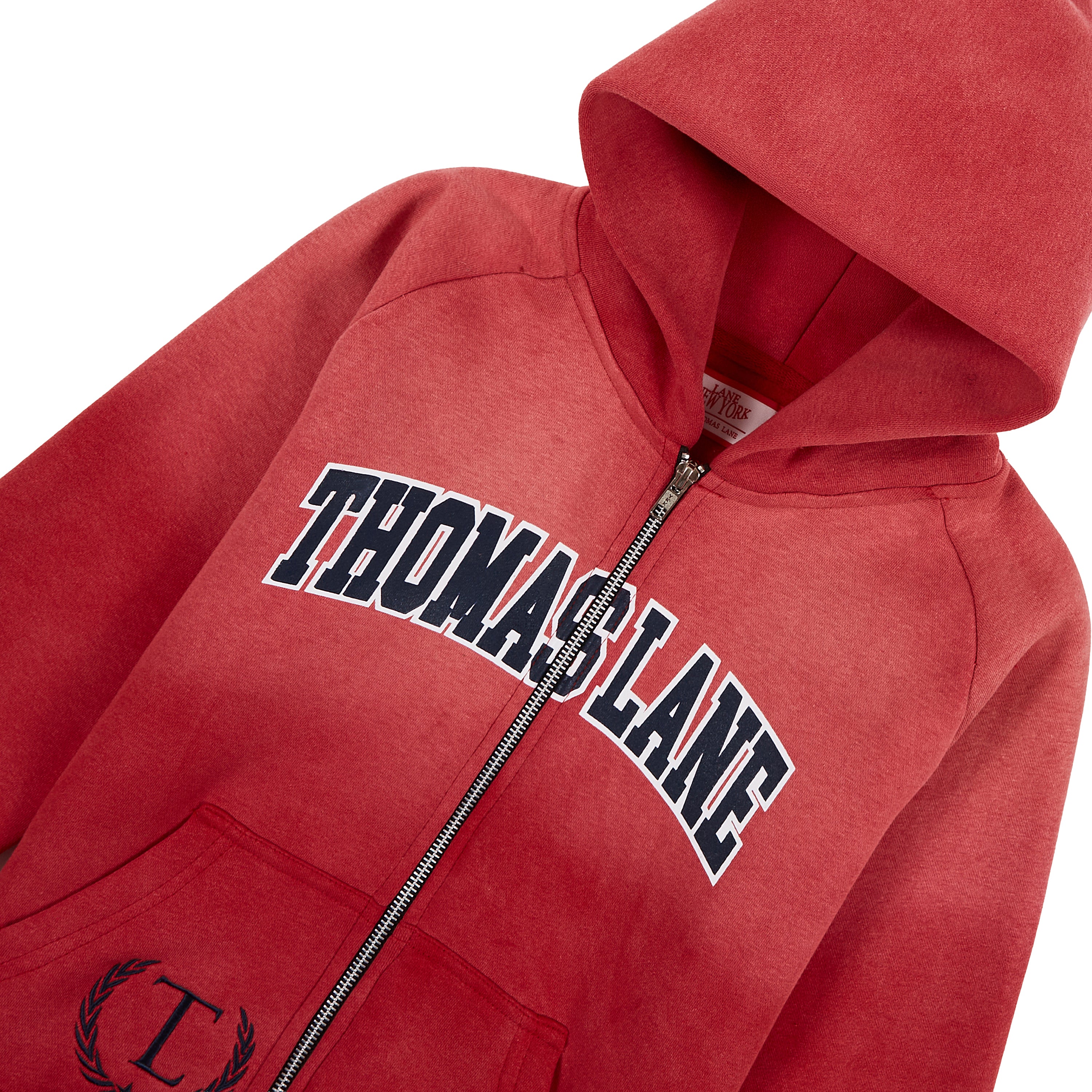 Bold Collegiate Branding – The hoodie features an arched “THOMAS LANE” applique across the chest, evoking classic varsity aesthetics.